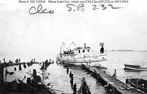 Cleo was built as a civilian motorboat of the same name in 1908 by Johnson at Marine City, Michigan. She was in the service of the Michigan State Game, Fish and Forestry Department when the U.S. Navy acquired her from the State of Michigan and placed her in service as USS Cleo (SP-232) in April 1917 for World War I service as a patrol vessel. Sources differ on whether she was commissioned[2] or served in a non-commissioned status.[3]