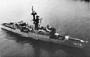 The Knox-class ships were armed with a 5"/54 caliber Mark 42 gun forward and a single 3-inch/50-caliber gun aft. They mounted an eight-round ASROC launcher between the 5-inch (127 mm) gun and the bridge. Close-range anti-submarine defense was provided by two twin 12.75-inch (324 mm) Mk 32 torpedo tubes. The ships were equipped with a torpedo-carrying DASH drone helicopter; its telescoping hangar and landing pad were positioned amidships aft of the mack. Beginning in the 1970s, the DASH was replaced by a SH-2 Seasprite LAMPS I helicopter and the hangar and landing deck were accordingly enlarged. Most ships also had the 3-inch (76 mm) gun replaced by an eight-cell BPDMS missile launcher in the early 1970s.[3] None of the class was actually built mounting a 3-inch gun.