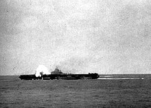 When the 10th Army landed on the western coast of Okinawa on 1 April, Hancock was on hand to provide close air support. A kamikaze cartwheeled across her flight deck on 7 April and crashed into a group of planes while its bomb hit the port catapult to cause a tremendous explosion. Although 62 men were killed and 71 wounded, heroic efforts doused the fires within half an hour enabling her to be back in action before an hour had passed.[2]