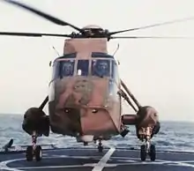 A camouflaged CSAR SH-3H of HS-11 on Peterson off Libya, 1986.
