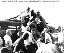 On 17 September 1950 a pair of Grumman F9F-2 Panthers launched from the deck of Philippine Sea. VF-112 Ensign Edward D. Jackson Jr. was leading a section dispatched to strafe an airfield near North Korea's capital, Pyongyang.[31] Flying on his wing was Ensign Dayl E. Crow. The airfield turned out to be little more than a grass strip littered with burned and shattered Soviet-built war machines. After strafing a locomotive and setting it ablaze, the jets turned north and started down the Han River.[32] Soon, Jackson spotted about 75 river boats. When they starting receiving small arms fire from "passengers" on the vessels, Crow followed Jackson down as they made a low strafing pass, splintering many of the small craft with 20 mm cannon fire. After the pass both attackers started to climb from 50 feet (15 m) AGL. Jackson then flew through an aerial booby trap: steel cables strung across the Han to "clothesline" low flying planes. The Panther ripped through the cables like twine, but the whipsawing cable strands caught the starboard wing, shredded the wingtip tank and snapped across the canopy, punching out the windscreen and side windows. The impact knocked Jackson unconscious with severe facial injuries.[31] Crow, flying just astern noticed something wrong, then saw the crushed wing tank and shattered canopy, its inner surface misted with blood. After 20 seconds[33] Jackson regained consciousness and found himself blinded by shards of Plexiglas and blood. Crow was able to guide his leader towards the Yellow Sea, but Jackson was fading in and out of consciousness. With only the left flap down due to damage to the right wing the Panther approached the ship and with the help of LSO Lt.j.g. "Les" Bruestle[33] and Crow the blind pilot trapped the #4 wire on the first attempt. Jackson survived with 36 stitches and an emergency blood transfusion.[32]