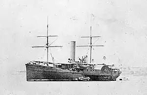 Throughout 1866, Rhode Island continued to cruise in the Atlantic and West Indies, from April 1866 flying the flag of Rear Admiral James S. Palmer. On 15 January 1866, Seaman William B. Stacy was awarded the Medal of Honor for rescuing a drowning crewmate while the ship was in the harbor of Cap-Haïtien, Haiti.[4] Calling once at Halifax in 1867 before being decommissioned, Rhode Island was sold to G. W. Quintard on 1 October 1867. Redocumented as Charleston on 8 November 1867, the side-wheeler remained in merchant service until abandoned in 1885.