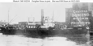 Sioux was built in 1916 by the American Ship Building Company, Cleveland, Ohio, was acquired by the U.S. Navy on 1 December 1917 from the Clyde Steamship Co., New York City, and commissioned the same day as a unit of the Naval Overseas Transportation Service.