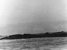 Throughout the night of 6 June and into the morning of 7 June, Yorktown remained afloat; but by 05:30 on 7 June, observers noted that her list was rapidly increasing to port. Shortly afterwards, the ship turned over onto her port side, and lay that way, revealing the torpedo hole in her starboard bilge- the result of the submarine attack. Captain Buckmaster's American flag was still flying.[10] All ships half-masted their colors in salute; all hands who were topside with heads uncovered came to attention, with tears in their eyes. Two patrolling PBYs appeared overhead and dipped their wings in a final salute.[10] At 07:01, the ship rolled upside-down, and slowly sank, stern first, in 3,000 fathoms (5,500 m) of water with her battle flags flying.[4] To most who witnessed the sinking, the Yorktown went quietly and with enormous dignity- "like the great lady she was," as one of them put it.[10] In all, Yorktown's sinking on 7 June 1942 claimed the lives of 141 of her officers and crewmen.[11]