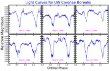 Six representative white-light light curves for UW Coronae Borealis, adapted from Hakala et al. (2009)[3]