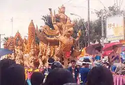 The procession takes place on the morning of Wan Kao Pansa. The candles are paraded through the city centre on floats, accompanied by representatives of the respective institutions. These are normally dancers or musicians in traditional dress.