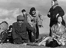 According to Professor Martha P. Nochimson, a common interpretation of the film is that Mizoguchi refashioned the stories of Ugetsu Monogatari to express regret about the pro-war extremism leading to World War II, with Mizoguchi personally having made the pro-war propaganda film The 47 Ronin in 1941.[28] These reflections on militarism, greed and arrogance connected with audiences not only in Japan but around the world in the wake of the war.[29] The subplot of Tōbei and Ohama particularly reflects the comfort women, who were made into prostitutes by the Imperial Japanese Army. Mizoguchi struggled with Daiei to give the subplot an unhappier ending than what appears in the film, in line with real comfort women's experiences after the war.[30] Tōbei's subplot reveals the mistake of war can also be a "tragicomedy".[31]