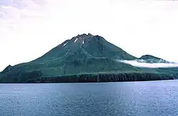 Uliaga Island (also spelled Uliagan, Ouliaga, and Ouilliaghui;[1] Russian: Уляга) is the northernmost member of the Islands of the Four Mountains group in the Aleutian Islands of southwestern Alaska. The island's name is probably derived from the Aleut place name ulaĝa, which is itself derived from ulaẍ - "bearberry."[2] The triangular shaped island measures about 2.4 miles (3.9 km) across and consists of a single stratovolcano cone that reaches a height of 2,913 feet (888 m).[3] The island has an area of 3.44 square miles (8.9 km2). No eruptions have been recorded in historical times, though it is thought to have been active at some time during the Holocene Epoch.[3]