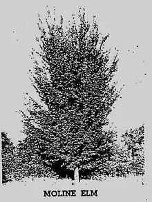 A photograph captioned 'The Moline elm as it is growing in Moline, Illinois' in the Arnold Arboretum paper 'Elms grown in America' (1951)[9] in fact shows a specimen of the field elm cultivar 'Umbraculifera' in Moline. [10]