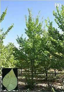 The field elm cultivar Ulmus minor 'Ademuz' was cloned by root cuttings from a tree assumed to be growing in or near the eponymous town 100 km north-west of Valencia,[1] Spain. The tree was discovered in 1996 by Margarita Burón of the Escuela Técnica Superior de Ingenieros de Montes, Universidad Politėcnica de Madrid (UPM). 'Ademuz' is one of a number of U. minor clones found to have a very high resistance to Dutch Elm Disease, on a par with, if not greater than, the hybrid cultivar 'Sapporo Autumn Gold' grown as a control. In the Madrid study, the appearance of the tree was rated 4.5 / 5, the most attractive of the seven selected cultivars.[1]