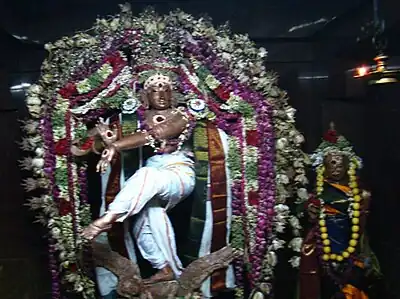 The temple priests perform the pooja (rituals) during festivals and on a daily basis. Like other Shiva temples of Tamil Nadu, the priests belong to the Shaivaite community, a Brahmin sub-caste. The temple rituals are performed six times a day; Ushathkalam at 5:30 a.m., Kalasanthi at 8:00 a.m., Uchikalam at 10:00 a.m., Sayarakshai at 6:00 p.m., Irandamkalam at 8:00 p.m. and Ardha Jamam at 10:00 p.m. Each ritual comprises four steps: abhisheka (sacred bath), alangaram (decoration), neivethanam (food offering) and deepa aradanai (waving of lamps) for both Uma Maheswarar and Mattuvar Kuzhal Amman. The worship is held amidst music with nagaswaram (pipe instrument) and tavil (percussion instrument), religious instructions in the Vedas read by priests and prostration by worshippers in front of the temple mast. There are weekly rituals like somavaram and sukravaram, fortnightly rituals like pradosham and monthly festivals like amavasai (new moon day), kiruthigai, pournami (full moon day) and sathurthi. Abhishekam is done to Lord Nataraja 6 times in a year. Maasi, Avani, Puratasi on Valarpirai Chathurtasi thithi days, and Chithirai Thiruvonam, Aani Uthram, Marghazi Thiruvathirai star days [2] The temple is counted as one of the temples built on the banks of River Kaveri.[3]