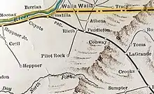 The Umatilla Central Railroad built a 14.21-mile (22.87 km) branch line of railroad in Umatilla County, Oregon, U.S., connecting the main line of the Oregon Railroad and Navigation Company (OR&N) at Rieth to Pilot Rock. The company was incorporated on May 24, 1906, and was operated under lease by the OR&N from opening date, December 16, 1907, until December 23, 1910, when the properties of both were sold to new Union Pacific Railroad (UP) subsidiary Oregon–Washington Railroad and Navigation Company.[1] The line has survived as UP's Pilot Rock Industrial Lead.[2]