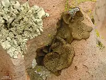 Umbilicaria phaea is a brown, umbilicate foliose lichen that grows up to 6 cm (2.4 in) in diameter, sometimes in colonies covering large patches of desert rocks.[1]:โ127โ [2] One variety that grows in northern California is brilliant red.[1] It is (monophyllous) with a single 1 โ 5 cm flattish leaf-like cap on top of an anchoring stem (umbilicate).[2] The leaflike top is smooth with some lobes, roughly circular, thin, and brittle.[2] The lower surface is light gray to light brown.[2] It has up to 2.5 mm black circular to slightly polygonal spots that are the fruiting bodies (apothecia), slightly sunken into the main nonfruiting body part (thallus).[2] It grows on siliceous boulders in very dry climates of western North and South America, where it is usually the most common member of its genus.[2]