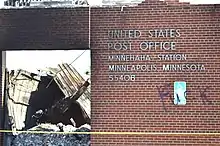In Minneapolis, approximately 1,300 properties were damaged by the rioting and looting,[98] nearly 100 of which were destroyed or severely damaged.[99] Property damages, which did not include loss of business inventory, were approximately $107 million, according to the Minneapolis Assessor's Office.[34] Overall, the city estimated damages and losses were $350 million and affected 22,000,000 square feet (2,000,000 m2) of commercial property.[100] Three post office branches of the United States Postal Service were among the properties destroyed by fire during the riots.[101][102] Thirty-five families lost their housing in buildings that were damaged by fire.[103]