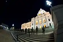 A multi-agency government command that responded to the riots and unrest demobilized on June 7, 2020. The government response was led by Minnesota Department of Public Safety and had participation of federal agencies, Minnesota National Guard, Minnesota Department of Public Safety, Minnesota State Patrol, and Minnesota Department of Natural Resources. In addition to the 7,123 National Guard troops who were pressed into duty, the state also mobilized 575 state patrol troopers and 190 conservation officers for the riot response.[74][11] Chain-link fencing and cement barricades, however, remained wrapped around the Minnesota capitol building in Saint Paul for nearly a year later, until June 1, 2021.[75]