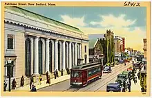 A photo taken by Lewis Hine in 1911 with a streetcar in New Bedford.