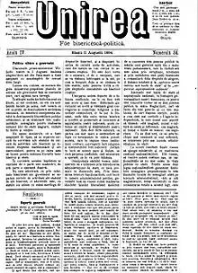 Unirea ("The Union") was a newspaper published at Blaj, in the Transylvania region, which was administered by the Kingdom of Hungary and eventually became part of Romania in 1920. Appearing between January 3, 1891, and March 24, 1945, it was an official publication of the Romanian Greek-Catholic Church.[1]