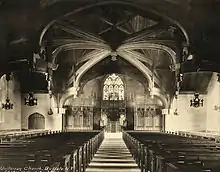 The Art Nouveau stained glass windows were designed by Harry E. Goodhue, of Boston who also designed stained glass windows for Saint Martin's Church, Providence. The pipe organ in the choir loft was built by the Hutchings-Votey Organ Company in 1906. Hutchings-Votey also built the Newberry Memorial Organ in Woolsey Hall at Yale University and the Naval Academy Chapel Organ located in the United States Naval Academy Chapel in Annapolis, Maryland. The Delaware Organ Company of Tonawanda, New York rebuilt the organ in 1960.[5]
