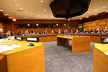 The Secretariat Building was designed in the International Style[2] by a team of ten architects working under planning director Wallace K. Harrison.[21][22] The Board of Design comprised N. D. Bassov of the Soviet Union; Gaston Brunfaut of Belgium; Ernest Cormier of Canada; Le Corbusier of France; Liang Seu-cheng of China; Sven Markelius of Sweden; Oscar Niemeyer of Brazil; Howard Robertson of the United Kingdom; G. A. Soilleux of Australia; and Julio Vilamajó of Uruguay.[23][24] Abel Sorenson was the interior designer.[25] In addition, David Fine of United States Steel oversaw the construction of the Secretariat Building.[26] The building houses the administrative functions of the UN, including day-to-day duties such as finance and translation.[5][22] It contains three basement levels and 39 above-ground stories.[27][28][29] When the building was completed, it was cited as measuring 544 ft (166 m) tall,[28][29][30] although Emporis and The Skyscraper Center both cite the height as 505 ft (154 m).[1][2]