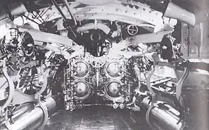 These vessels included some features intended to increase underwater speed that were standard on US submarines of this era, including a small sail and a rotating cap over the torpedo tube muzzles. For extended surface runs, the small sail was augmented with a temporary piping-and-canvas structure (see photo). Apparently the "crash dive" concept had not yet been thought of, as this would take considerable time to deploy and dismantle. This remained standard through the N class, commissioned 1917-1918. Experience in World War I showed that this was inadequate in the North Atlantic weather, and earlier submarines serving overseas in that war (E class through L class) had their bridge structures augmented with a "chariot" shield on the front of the bridge. Starting with the N class, built with lessons learned from overseas experience, US submarines had bridges more suited to surfaced operations in rough weather. The streamlined, rotating torpedo tube muzzle cap eliminated the drag that muzzle holes would otherwise cause. In the stowed position, the submarine appears to have no torpedo tubes, as the holes in the cap are covered by the bow stem. This feature remained standard through the K class, after which it was replaced with shutters that were standard through the 1950s.