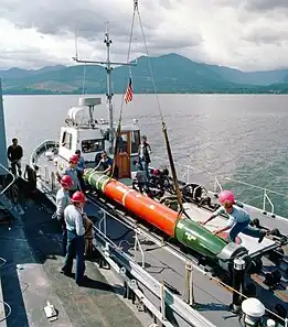 Torpedo retriever boats are but one of the ways spent exercise and test weapons have been recovered by the Navy. Malfunctioning torpedoes that sink require different approaches. Divers, nets, grapples, and magnetic detectors have been used to search for lost weapons starting as early as 1919.[3][12] A descendant of these early methods, recovering munitions as deep as 20,000 feet (6,100 m), were a series of increasingly sophisticated cable-controlled robots called CURV.[13] Beginning in the 1950s, the Navy experimented with training a variety of marine mammals to recover sunken torpedoes. Orca, beluga whales, pilot whales, and bottle-nosed dolphins were all trained with some level of success. As robots became more capable and cheaper, this program was discontinued.[14]