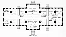 University Hall is a four-story, seventeen bay structure. The building's largely rectangular form measures approximately 150 long and 46 feet wide. The central three bays of the building project an additional ten feet forward, forming pedimented pavilions measuring 33 feet across. The structure's hipped roof is decorated with an ornamental balustrade and features a central cupola.[9]