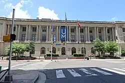 The University of Memphis, School of Law building (also commonly known as the Customs House, Post Office, or Courthouse reflecting its prior uses) is a 5-story former federal building, located in downtown Memphis. As of 2010, the building is owned entirely by the University of Memphis and houses its law school. It is located at the corner of Front Street and Madison Avenue. It has 169,000 square feet (15,700 m2) of usable space that has been re-purposed as classrooms, offices, and administrative space. One of the original courtrooms from the building's former use as a courthouse has been restored as the University of Memphis moot courtroom.[2] The building is made of steel and concrete, and employs many decorative elements including Tennessee marble, granite, and detailed plaster work.