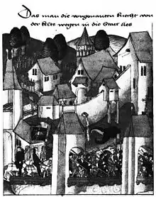 The need for a river crossing became urgent soon after the founding of Bern in 1191.[3] The young city-state's first attempt at building a wooden bridge over the Aare triggered a war with Count Hartmann of the powerful House of Kyburg that controlled the territory east of the Aare.[4] Thanks to a peace mediated by Savoy, the first Untertorbrücke could be completed in 1256.[5] In 1288, it survived a heavy attack during King Rudolph of Habsburg's second siege of Bern.[6]