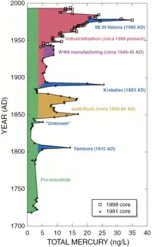 - 1 2 3 Krabbenhoft, David; Paul Schuster. "Glacial Ice Cores Reveal A Record of Natural and Anthropogenic Atmospheric Mercury Deposition for the Last 270 Years" (PDF). USGS Fact Sheet FS-051-02. U.S. Geological Survey. Retrieved August 12, 2012.