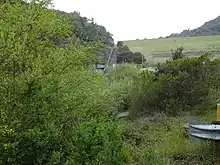 Dam constructed in 1977, with the spillway toward the left. The earth-filled dam is green because it is covered with grass.