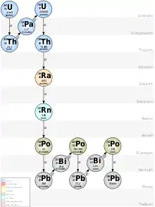 A uranium radionuclide is a radioactive isotope. Radioactivity is natural in the environment, however uranium radionuclides can lead to radioactive decay. In the case of uranium mines, these radionuclides can leach into the water and cause the radioactivity to be carried elsewhere, as well as form precipitates that can be harmful to the environment. The uranium radionuclides can eventually be carried to fruits and vegetables via contaminated waters. Sulfuric acid, oxidation, and alkaline leaching are processes of how radionuclides make their way into the environment. When uranium decays it also produces the isotopes 226Ra and 222Rn, which may be environmentally harmful due to the fact that radon is present as an inert gas and therefore, might enter into the soil or atmosphere. Radon then can emit alpha particles and gamma radiation.[6] The three different radioactive isotopes of uranium are uranium-238, uranium-235, and uranium-234. Each has a different half-life which determines the isotope's decay rate.[7] When uranium-235 combines with other molecules it creates a chemical reaction that can cause detrimental effects to water. Even though isotope formation occurs naturally, when combined with other elements it can cause the pH of water to become more acidic as discussed previously.[8]