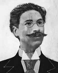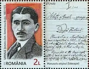 Urmuz's birth name was, in full, Dimitrie Dim. Ionescu-Buzeu (or Buzău), changed to Dimitrie Dim. Dumitrescu-Buzeu when he was still a child, and later settled as Demetru Dem. Demetrescu-Buzău.[1][2] The Demetrescu surname was in effect a Romanian patronymic, using the -escu suffix: his father was known as Dimitrie (Demetru, Dumitru) Ionescu-Buzău.[1][3][4] The attached particle Buzău, originally Buzeu, confirms that the family traced its roots to the eponymous town.[2][5] According to George Ciprian, the names Ciriviș (variation of cerviș, Romanian for "melted grease") and Mitică (pet form of Dumitru) were coined while the writer was still in school, whereas Urmuz came "later".[6]