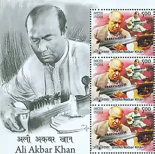 Khan was awarded the Padma Bhushan in 1967[18] and the Padma Vibhushan in 1989,[19] among other awards. He received a MacArthur Fellowship in 1991,[10] the first Indian musician to receive the so-called "genius grant".[17] In 1997, Khan received the National Endowment for the Arts' prestigious National Heritage Fellowship, the United States' highest honour in the traditional arts.[20] Khan received five Grammy nominations over the course of his life.[17] In September 2014, a postage stamp featuring Khan was released by India Post commemorating his contributions.[21]