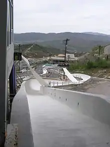 The following year, on June 15, 1991, Salt Lake City lost its 1998 Winter Olympics bid by four votes to Nagano, Japan.[2] Still, construction on the park commenced following a groundbreaking ceremony on May 29, 1991. The original estimated cost of the park was $26.3 million and included the ski jumps, bobsled/luge track, and a day lodge; following the completion of the ski jumps they were formally dedicated in a ceremony on January 9, 1993.[3] The track was designed by German luge coach Josef Lenz.[4]