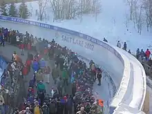 While construction was progressing on the track, Salt Lake City had won its 1995 bid to host the 2002 Winter Olympics, and plans were developed to expand the park. On October 9, 1997, the Salt Lake Organizing Committee (SLOC) authorized the plan to spend an additional $48 million to upgrade and expand the recently completed park. The plans called for the construction of starting houses on the track, chairlifts, storage buildings, and new access roads.[7] Ownership of the Park was transferred to SLOC from the Utah Sports Authority on July 14, 1999, and soon after the park's name was changed from the Utah Winter Sports Park to the Utah Olympic Park.