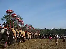 Pooram is a Kerala Hindu ritual festival in which generally caparisoned elephants are led in a controlled and organized procession. At Uthralikkavu Pooram, three teams, each from neighboring village temples Enkakkad, Kumaranellur and Wadakanchery participate. Each team normally presents seven to eleven elephants, all decorated with traditional trunk masks (netippaTTam നെറ്റിപ്പട്ടം), shields (aalavaTTamആലവട്ടം) and fans(veNchaamaram വെൺചാമരം). The elephant positioned at the middle will also have a large plaque (thiTamp തിടമ്പ് or kOlam കോലം)on its top which represents the deity. There are many festivals in kerala used to celebrate like this. Some of them are Thrissur Pooram, Nenmara Vallangi Vela, Arattupuzha pooram, chinakathur pooram etc.