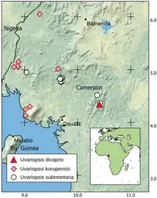 Uvariopsis dicaprio is endemic to the Ebo Forest,[4][6] in the Littoral Region of Cameroon. It has a limited range, having only been found on the Dicam trail 2000 meters away from Bekob camp; multiple botanical surveys in the Ebo Forest and surrounding areas have not identified any additional specimens. It is found in the submontane forest, at elevations from 200 to 1,200 m.[2]: 10