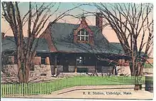 Uxbridge station is a former railroad station in Uxbridge, Massachusetts. Built in 1895, it is a well preserved example of Queen Anne architecture. On October 7, 1983, it was added to the National Register of Historic Places as Uxbridge Passenger Depot. It served as a significant transportation hub and the town's main passenger station for more than 50 years.
