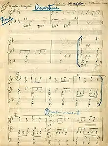 In 1908, Hajibeyov wrote his first opera, Leyli and Majnun, based on the tragic love story[13] by the 15th century poet Fuzûlî. This would be the first of 7 operas and 3 musical comedies that Hajibeyov would compose throughout his life. In Leyli and Majnun, the uniqueness of the traditional modal music of mugham was incorporated into a Western genre with the use of instruments indigenous to both traditions.[14]