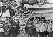 Despite several initiatives starting in 1889,[2] the first mountain troops were formed in November 1916. Through Order no. 294, the Military School of Skiing was transformed in the "Corps of Mountain Hunters" (Corpul Vânătorilor de munte). It was organized in three battalions, each with three companies. In January 1917, the Corps was reorganized into the "Mountain Hunter Battalion" (Batalionul Vânătorilor de Munte). It consisted of 5 infantry companies, 2 machine gun companies and a wireless telegraphy section.[1] Each company took a nickname: the 1st was nicknamed Tigrii, the 2nd Șoimii, the 3rd Haiducii, the 4th Leii, and the 5th Pandurii, while the 1st and 2nd machine gun companies were nicknamed Smeii and Balaurii respectively. This tradition was kept until after the Second World War.[3]