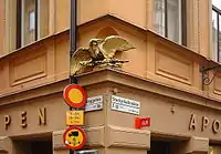On Number 16 is the gilded raven of Apoteket Korpen ("The Raven pharmacy") founded in 1674 and located on Stortorget during 250 years. It was one of the few and one of the oldest pharmacies in Stockholm, a city with all to few doctors and frequently ravaged by epidemics, flues, and plague, pestilences thought to be cured using frogs, snakes, human fat, and pulverized mummies.[6] Today there is a preserved interior from 1924, and the pharmacy only offers factory-made medicine, except for the Christmas mustard made after its own recipe.[9]