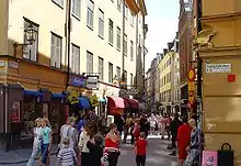 Notwithstanding, Swedes and tourists alike still love to mingle among the boutiques, the medieval gables and the later additions, the street thus preserving its old ways still offering its musicians to Stockholmers hurrying to work in the morning; blustering pub-crawlers still vexing stoic dwellers, and the old forged iron signs continuing to ignore the neon signs still tempting passers-by with all sorts of gadgets.[2][3] Gone are, however, the filth, funeral processions, and prostitution in the area brilliantly described by the troubadour Carl Michael Bellman.