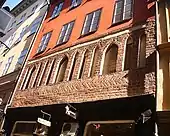 During a restoration in 1946, a medieval bricked wall was discovered on Number 29, today exposed over the shop windows. The eleven pointed arches and the bricked herringbone pattern, dates back to the 14th century, while the glazed window are later additions the first glazier in Stockholm is mentioned in 1421 and glass was still luxury at the time, so these windows were shut using wooden shutters, some rays of light possibly passing in through scraped leather or panes of bones. The cast iron columns on street-level are from the 19th century.[12]