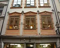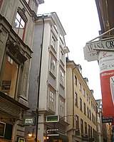 Number 70 is a medieval building but the exterior was created in the early 17th century. On the front facing Funckens Gränd are the initials of former owners: L L D L 1627, Lydert Lang and Dorotea Lang.[25] The present building on Number 72–74 is a product of the merging of two older buildings during the 20th century. In medieval times, these two buildings were separated by an alley of which remains a narrow and elongated backyard passing through the block. Various properties in the block have been merged and partitioned repeatedly over several centuries, and though virtually all traces of the medieval neighbourhood are gone, the present façade is decorated with bits and pieces of older buildings; placed in niches in the 1930s when the present shop front was built. The trader Thomas Funck owned most of the buildings in the neighbourhood in the 17th century, why he gave the alley its name. Number 76, mentioned together with the property on the opposite side of the block as "both buildings of late Funck", probably referring to one of the sons of the former. A medieval alley once passed through the building on Number 78, and the present building is partly from the early 17th century, while the shop windows and the attic were rebuilt in the 20th century.[26]