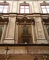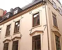 Above street level and behind the intact front, Number 7–17 are the semi-detached offices of the Riksdag. On number 7 are Roman letters displaying the year 1888 when the Neo-Renaissance sgraffito façade was created. On number 13 above the windows on the first floor, are the heads of Victor Emanuel II, Garibaldi and Cavour, obviously added by someone favourably disposed towards the Italian unification.[6] The entire block is hiding the northern end of Prästgatan, one of the few blind ends of the old town, which was historically known as Helvetesgränd ("Alley of Hell"), either because the city executioner resided in the area or because the entire neighbourhood is located north of the cathedral (e.g. in Norse folklore associated with the "Kingdom of the Dead").[7]