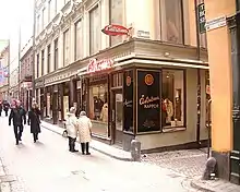 On Number 6 was until recently the bookstore Hemlins bokhandel. It was founded in 1864 and taken over by Emil Hemlin in the 1880s. From the late 18th century and well into modern times, the neighbourhood used to be the quarters of the 'printed word', the part of the city where both the books and their consumers were located, and were people from other parts of the country would come to find and talk about the latest novels.[6]