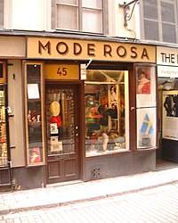 There used to be dozens of coat shops in central Stockholm, but today only two remain, one of which is located on Number 40, Åströms Kappaffär. The shop was founded in 1911, and the current owner, Eva Sjölund, have been working there since 1979, just like her mother and grandmother.[17]