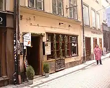 On Number 79 is the restaurant Mårten Trotzig, named after Mårten Trotzigs Gränd, the narrowest alley in the old town passing next to it, in its turn named after the merchant Mårten Trotzig (1559–1617) who owned a building in the alley. In the restaurant is an excavated medieval refuse chute once accessed through an exterior door.[25]