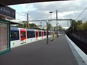 Le Vésinet–Le Pecq is a railway station in Le Vésinet, France, built in 1972, on the A1 branch of the Paris Region RER commuter rail line A. It primarily serves the communities of Le Vésinet, Le Pecq, and southern Montesson in the western suburbs of Paris.