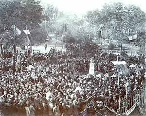 Urechia was vice-president of the Senate in 1896–1897.[3] During those years, he became Chevalier of the Légion d'honneur, honorary member and later honorary president of the Conseil Héraldique de France, foreign member of the French Archaeological Society, and associate member of the Spanish Red Cross,[6] and Ecuador's consul general to Romania.[9] Attending the October 1899 International Congress of Orientalists in Rome, he organized a Pan-Latinist festivity centered on Trajan's Column, with the participation of Luigi Pelloux cabinet ministers and the Transylvanian peasant activist Badea Cârțan. Although the ceremony enjoyed popularity and coverage in the press, Urechia and his Cultural League were frustrated by lack of funds in their attempt to organize a living exhibit of Romanian customs.[6] He attended the 1900 congress of the Union of Latin Students, meeting in the French town of Alès, and delivered an opening speech in which the main theme was Pan-Latinism.[6] The same year, he published a series of memoirs and travel writing pieces, under the title Din tainele vieții ("Some of Life's Secrets").[11]